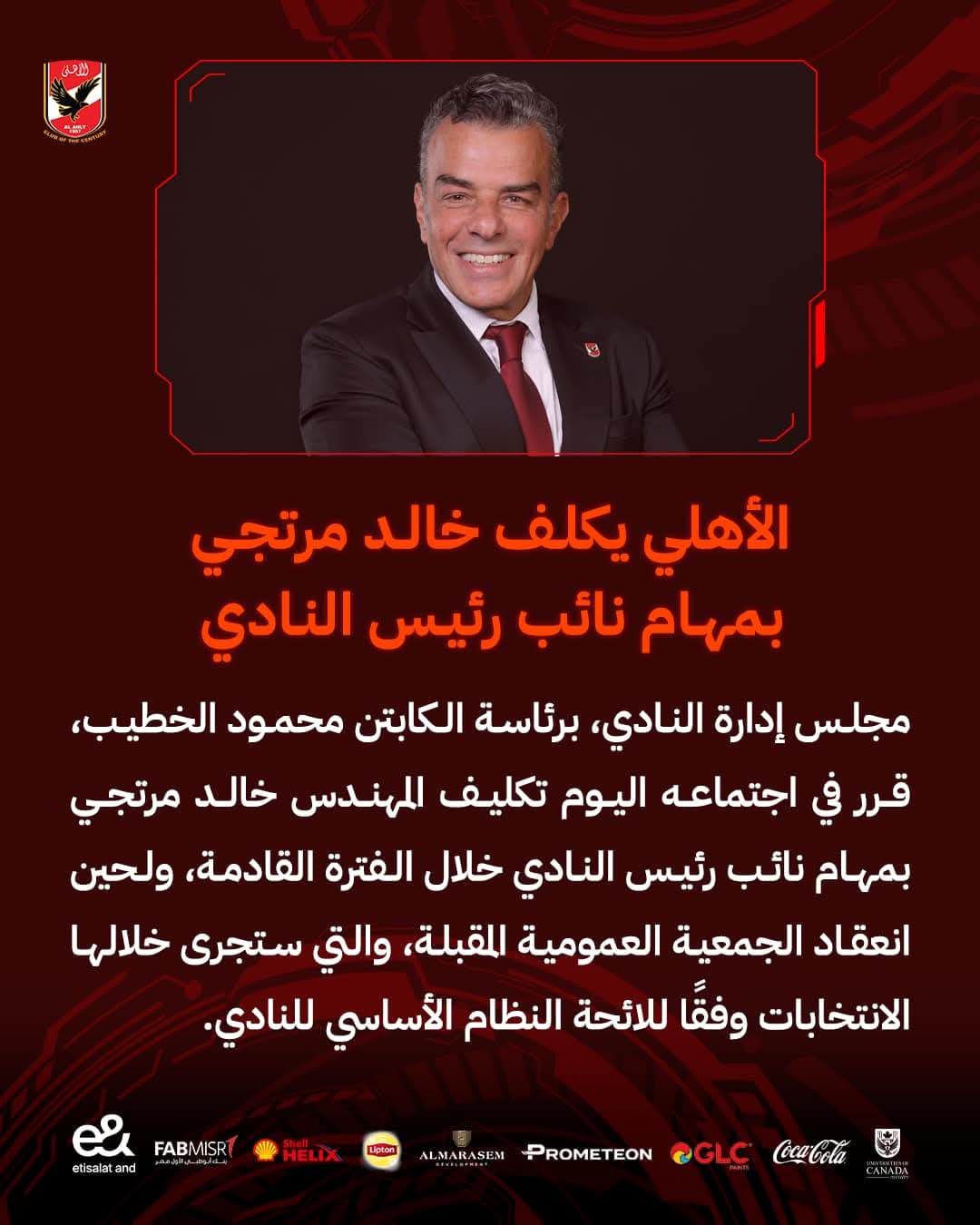 وقرر الأهلي في اجتماعه تكليف المهندس خالد مرتجي بمهام نائب رئيس النادي ولحين انعقاد الجمعية العمومية المقبلة، والتي ستجري خلالها الانتخابات وفقًا للائحة النظام الأساسي للنادي.