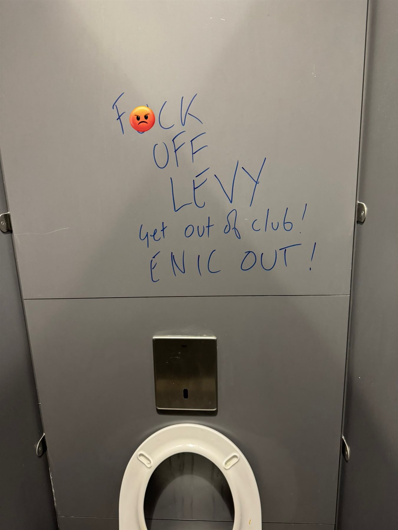 وكتب أحد مشجعي توتنهام رسالة في دورة المياه داخل الاستاد الذي احتضن مباراة الفريق أمام تشيلسي بالبريميرليج، إلى دانيل ليفي وملاك نادي توتنهام: ارحلوا عن النادي.