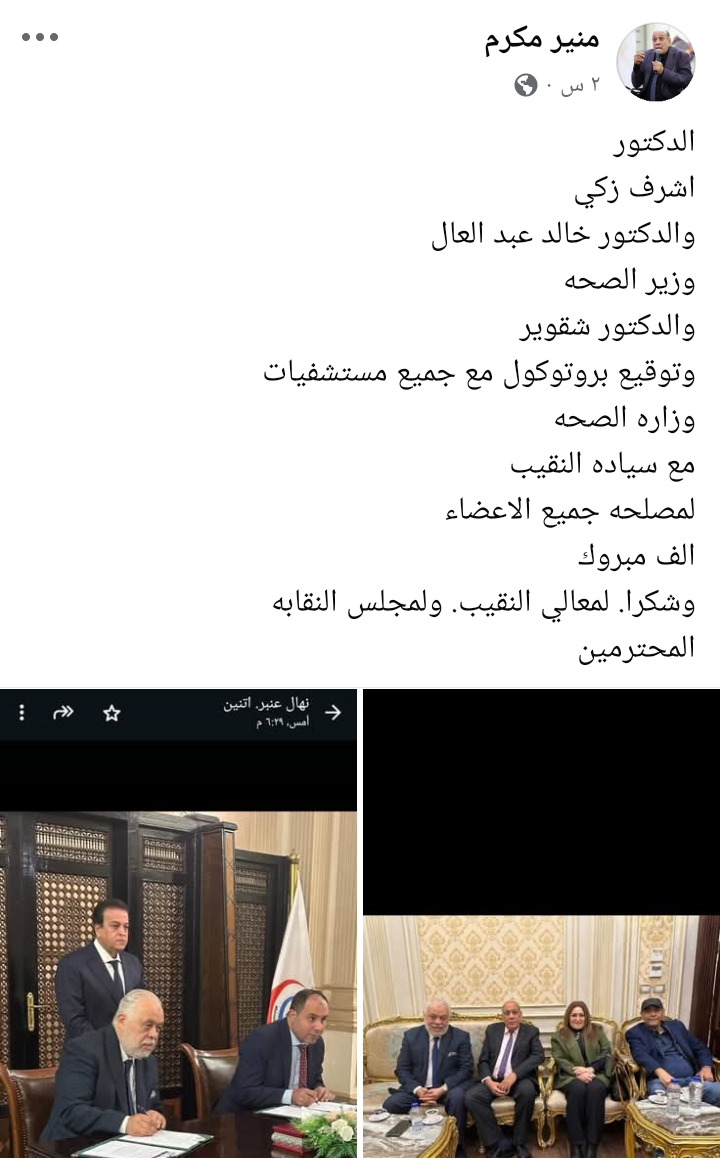 علق منير مكرم على الصور، قائلًا: الدكتور أشرف زكي، والدكتور خالد عبد الغفار، وزير الصحة، وتوقيع بروتوكول مع جميع مستشفيات، وزاره الصحة، مع النقيب لمصلحة جميع الأعضاء، وشكرًا للنقيب ولمجلس النقابة المحترمين.