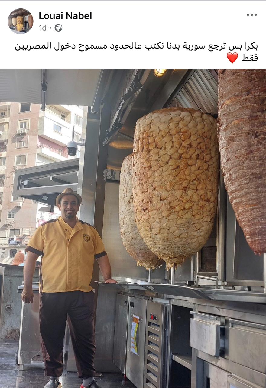 بكرا بس ترجع سوريا وسنكتب على الحدود مسموح دخول المصريين فقط.. بهذه الكلمات شارك لؤي السوري مُتابعيه عبر منصة فيسبوك للتواصل الاجتماعي بصورته أثناء عمله في أحد مطاعم الشاورما السورية الشهيرة بمصر، مُعبرًا عن حبه الشديد وإخلاصه للمصريين الذين أظهروا محبتهم وشهامتهم للشعب السوري منذ عدة سنوات بعد استقبالهم في مصر.