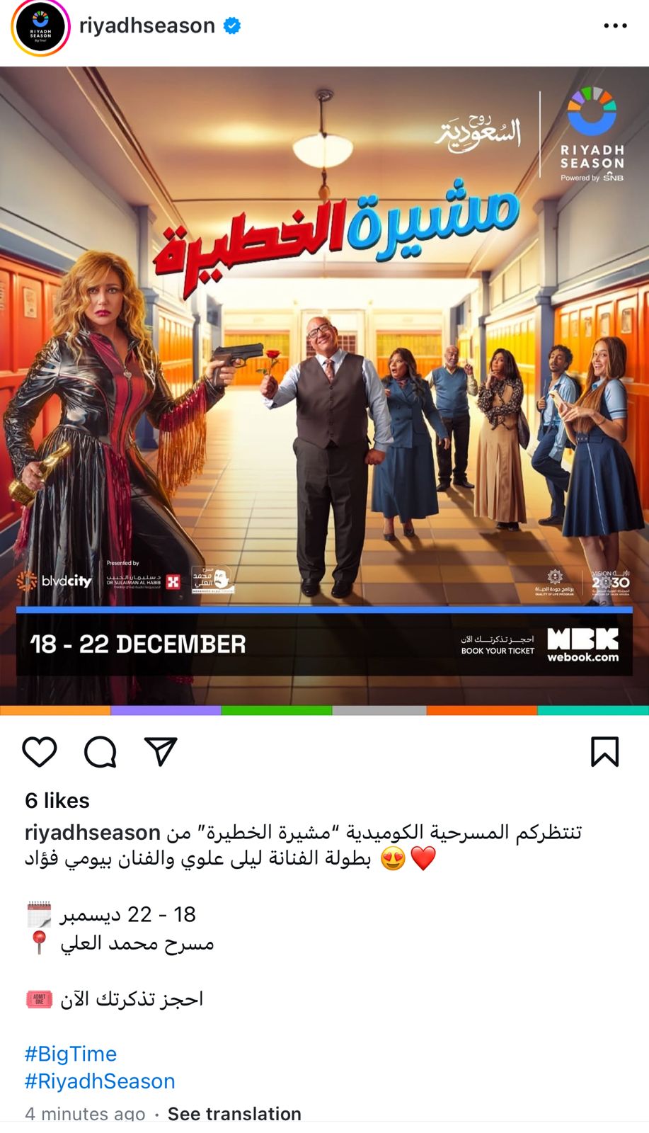 ينتظر أبطال مسرحية مشيرة الخطيرة، بطولة الفنانة ليلى علوي، عرضها في المملكة العربية السعودية، ضمن فعاليات موسم الرياض، على مسرح محمد العلي، ابتداءً من 18 ديسمبر الجاري، ومن المقرر أن تستمر حتى 22 ديسمبر.
