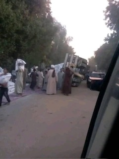 وأكمل أبو الحجاج: قمنا بفرش حصر على جانب الطريق وحملنا إليها أجولة الدقيق المتبعثرة على الطريق وجمعناها فوق بعضها، ولم يتغب جوال دقيق واحدة، وجمعنا حمولة السائق كاملة.