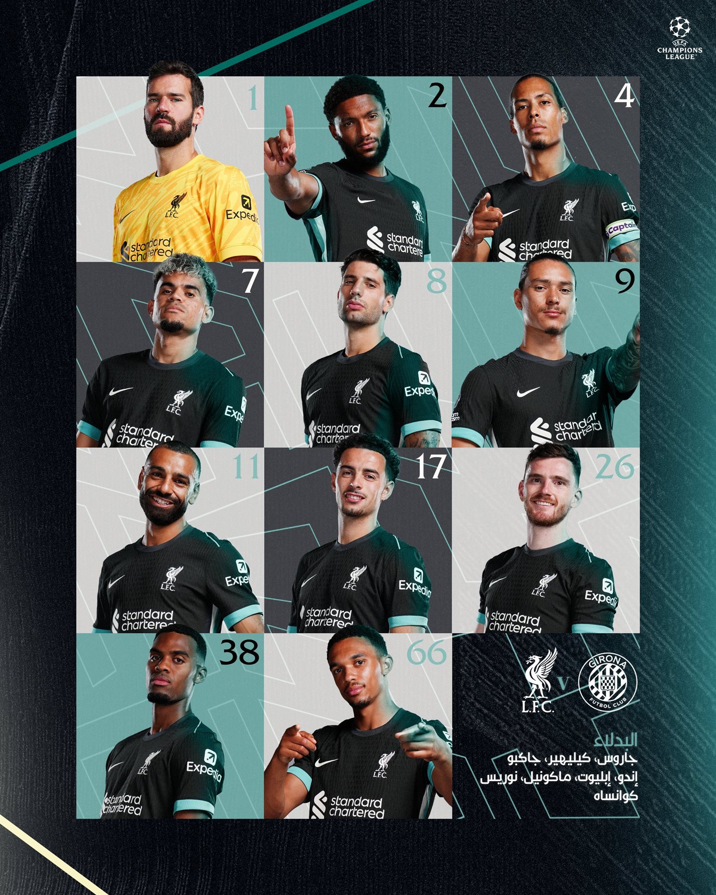 قرر الهولندي آرني سلوت المدير الفني لفريق ليفربول، أن يدخل مباراة فريقه ضد جيرونا في دوري أبطال أوروبا، بتشكيلة مكونة من: