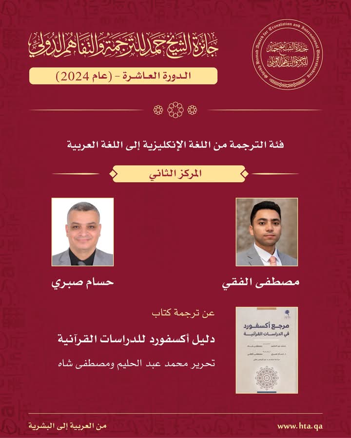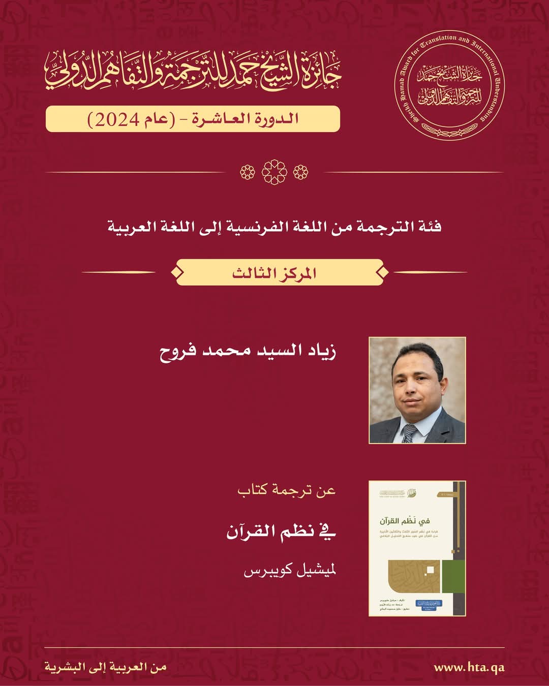 كما فاز أيضًا الدكتور زياد السيد محمد فروح، المدرس في قسم الدراسات الإسلامية باللغات الأجنبية شعبة اللغة الفرنسية بكلية اللغات والترجمة بالقاهرة منفردًا بجائزة الشيخ حمد للترجمة والتفاهم الدولي فئة الترجمة من اللغة الفرنسية إلى اللغة العربية لعام 2024م، المركز الثالث عن ترجمة كتاب: في نظم القرآن الكريم لميشيل كويبرس.