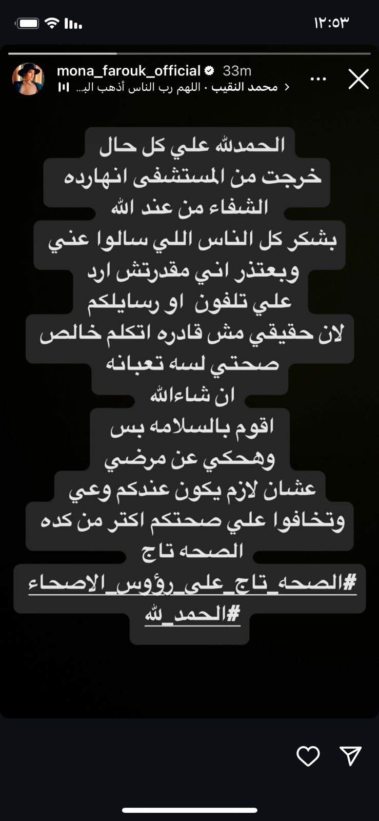 وكتبت منى فاروق، منشورًا عبر خاصيه ستورى على حسابها الشخصي بموقع تبادل الصور والفيديوهات إنستجرام: الحمد لله على كل حال خرجت من المستشفى النهاردة الشفاء من عند الله، بشكر كل الناس اللي سألوا عني وبعتذر إني مقدرتش أرد علي تليفوناتكم أو رسايلكم لأن حقيقي مش قادرة أتكلم خالص.