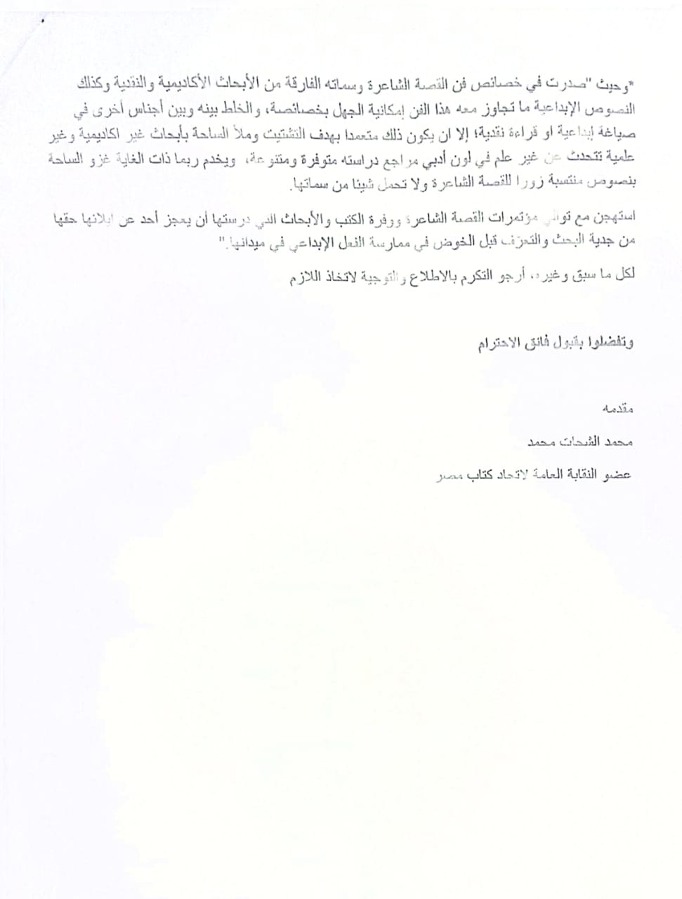 وحصل القاهرة 24 على صورة ضوئية من الشكوى، ومما جاء فيها أنه في مؤتمر النقابة الفرعية لاتحاد كتاب مصر بالإسماعيلية، جاء في صفحتي ١١٢ و١١٣ مقال، استهلته كاتبة المقال (ف.أ) بنص لها، اعتبرته نص قصة شاعرة، والنص ليس قصة شاعرة بناء على المعايير والخصائص الجمالية المُميّزة لفن القصة الشاعرة، ثم كان على مقالها عدة ملاحظات، ومنها: