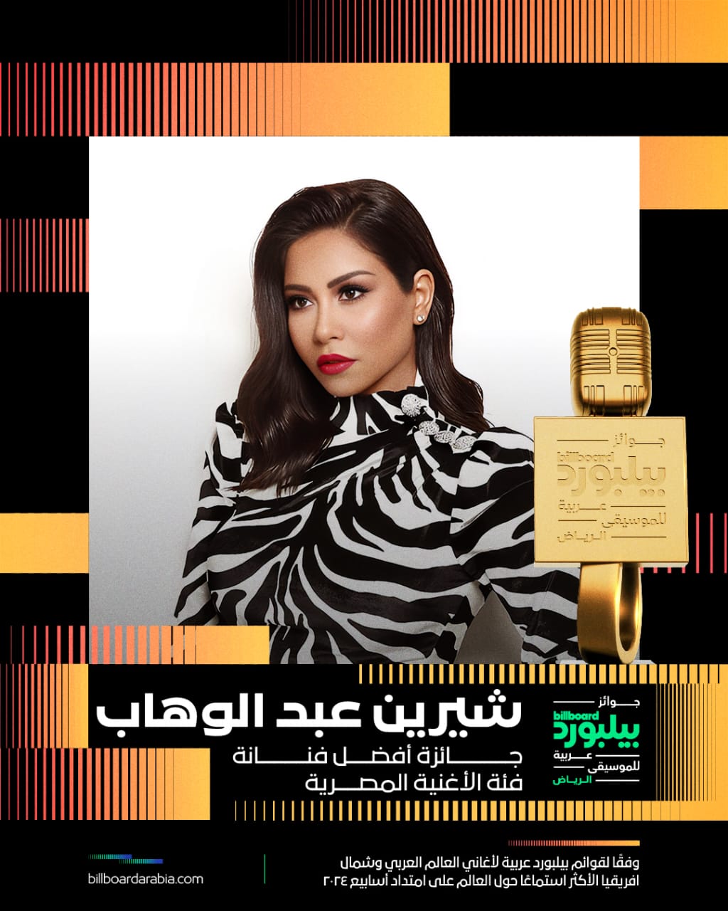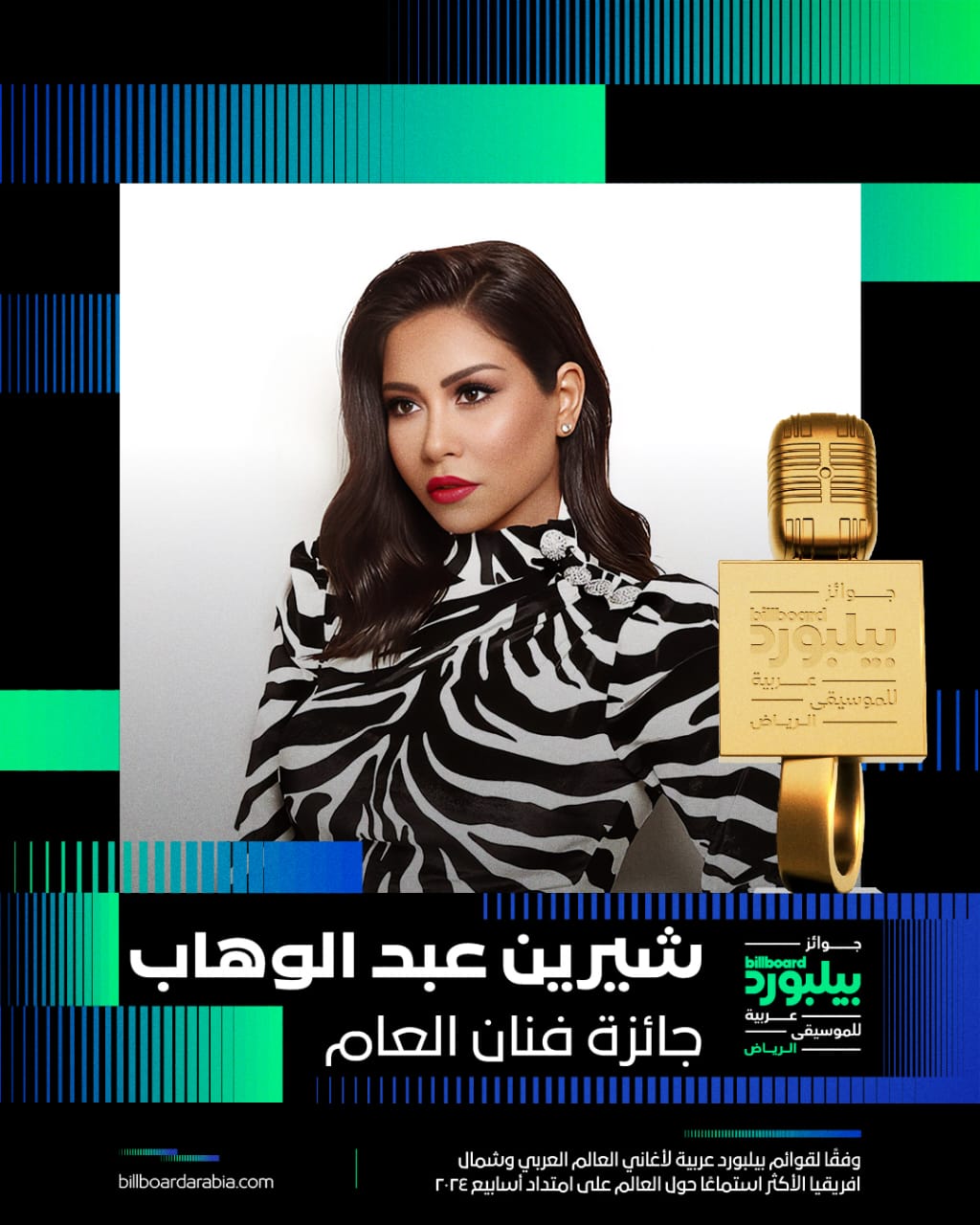 وجاءت جوائز شيرين عبدالوهاب في حفل بيلبورد كالتالي: أفضل فنانة، وفنانة العام، وأفضل فنانة فئة الأغنية المصرية، والفنانة الأولى فئة الأغنية المصرية؛ حيث تم اختيارها بناء على قوائم بيلبورد لأغاني العالم العربي وشمال إفريقيا الأكثر استماعًا خلال عام 2024.