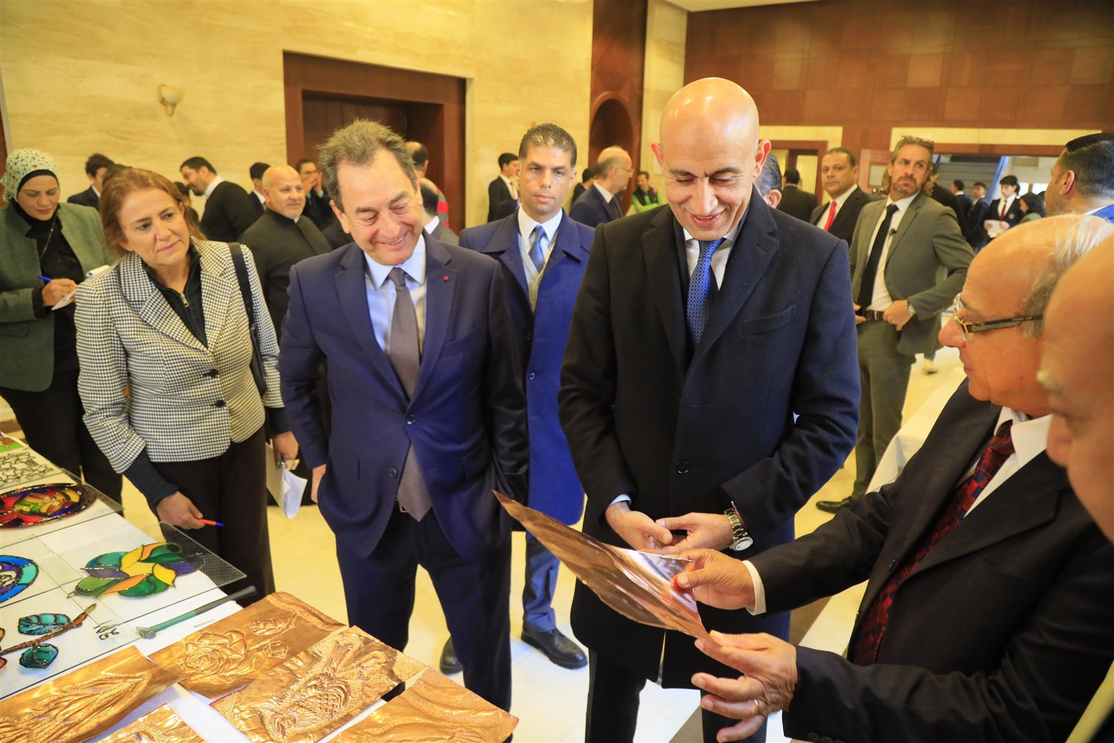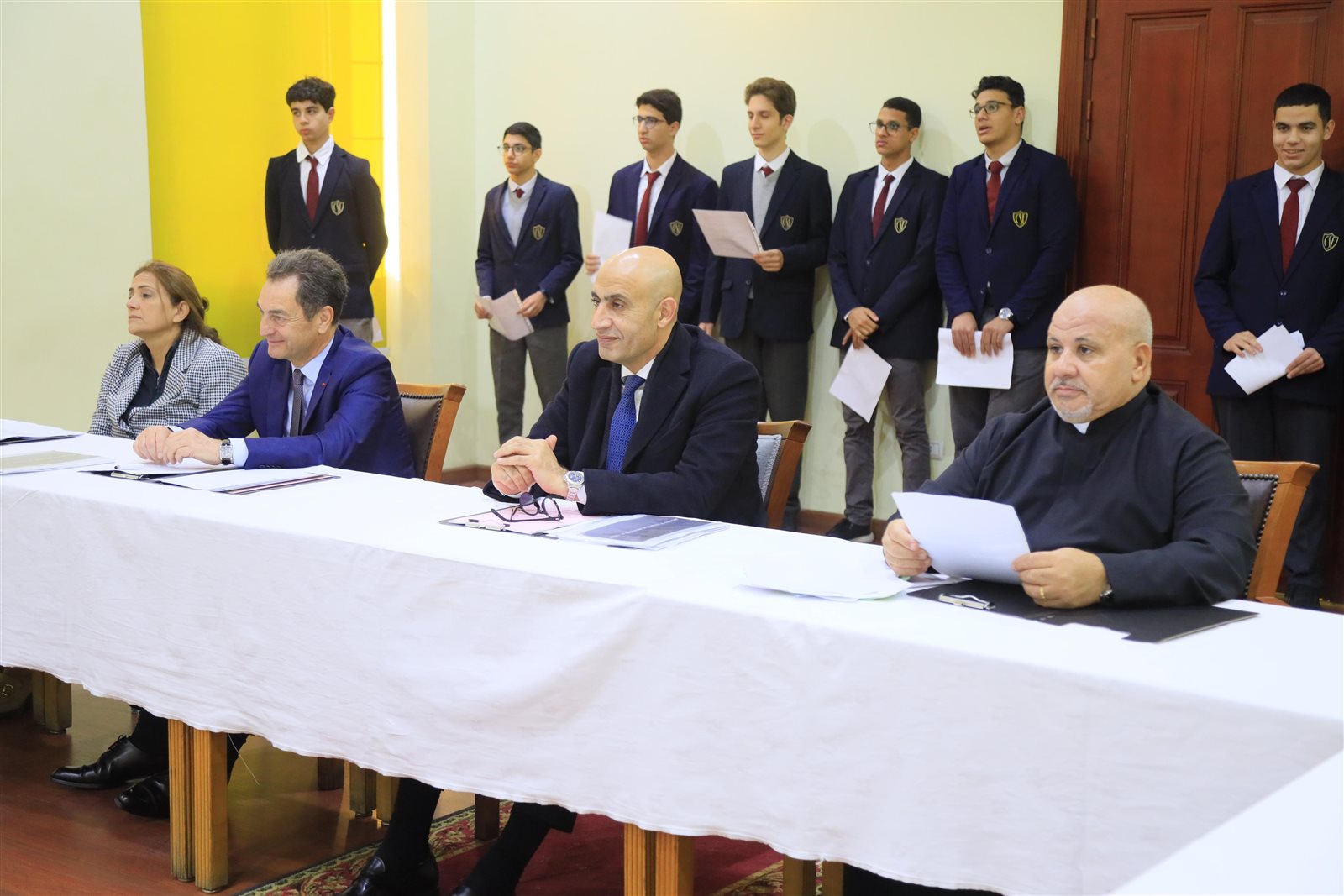 ورافق وزير التربية والتعليم والسفير الفرنسي، خلال زيارتهما السيد دانييل ريجنو ملحق التعاون التربوي بسفارة فرنسا، وفرانك توريس ملحق تعاون اللغة الفرنسية بالمعهد الفرنسي، والسيدة منال جندي مساعدة قطاع التعليم بالمعهد الفرنسي، والأب رومان أمين مدير مدرسة العائلة المقدسة الجزويت.