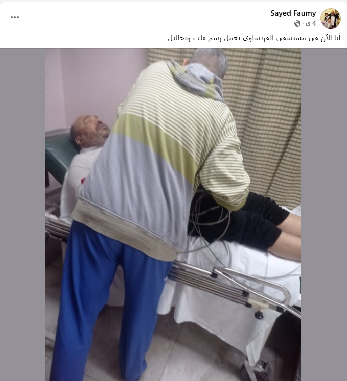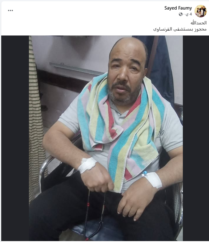 وبعدها بدقائق أعلن الفنان سيد فيومي، حجزه في مستشفى الفرنساوي، لسوء حالته الصحية، وحتى تماثله للشفاء، وانهالت عليه التعليقات بالأمنيات بالشفاء.
