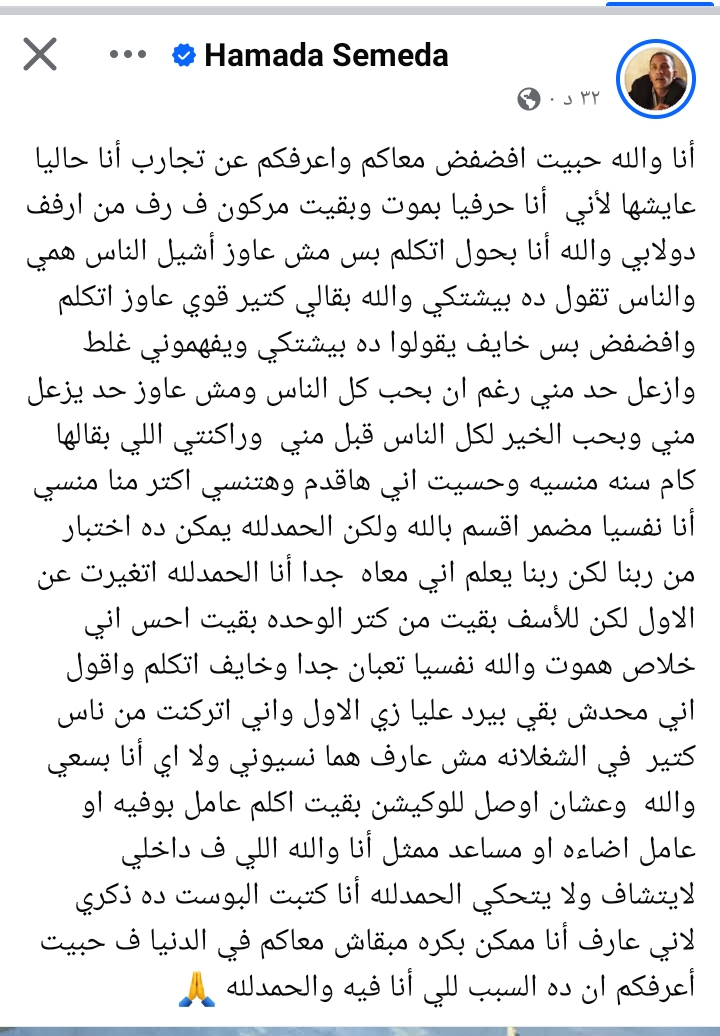 وكتب حمادة صميدة عبر حسابة الرسمي بـ موقع التواصل الاجتماعي فيسبوك قائلًا: أنا والله حبيت أفضفض معاكم وأعرفكم عن تجارب أنا حاليا عايشها لأني حرفيا بموت وبقيت مركون في رف من أرفف دولابي، والله أنا بحاول أتكلم بس مش عاوز أشيل الناس همي والناس تقول ده بيشتكي والله بقالي كتير عاوز أتكلم وافضفض بس خايف يقولوا ده بيشتكي ويفهموني غلط وأزعل حد مني رغم أني بحب كل الناس.