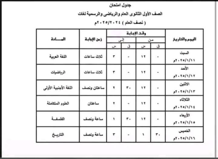 جدول امتحانات الصف الأول والثاني الثانوي الترم الأول 2025