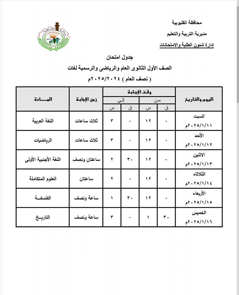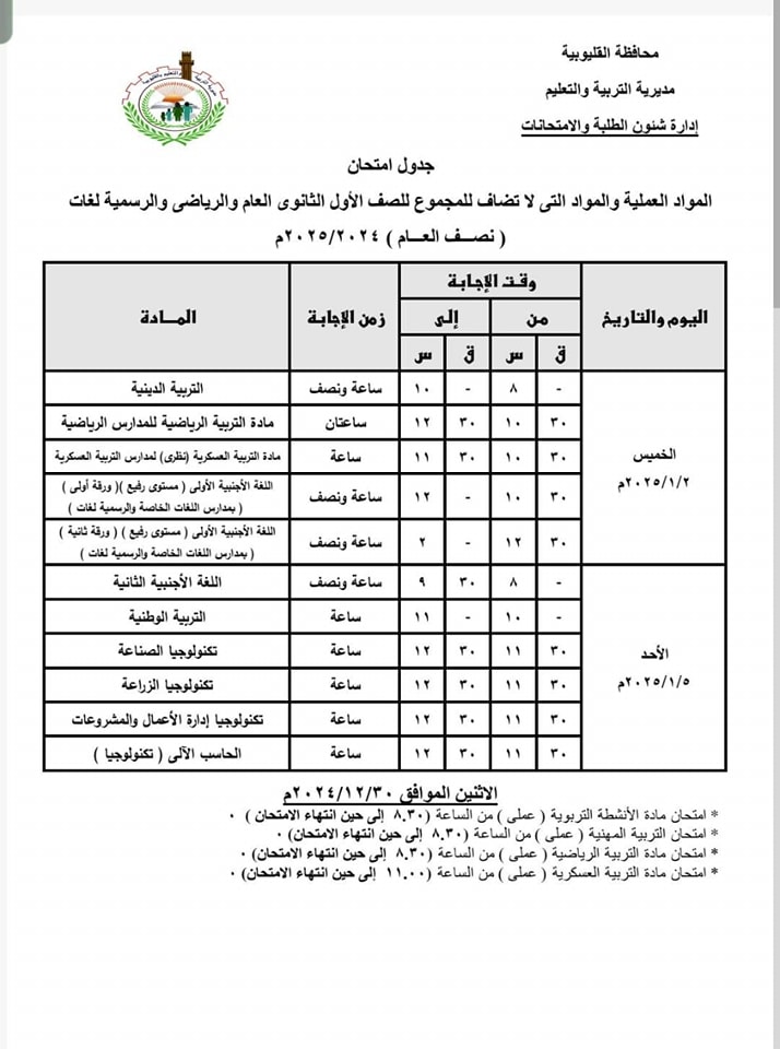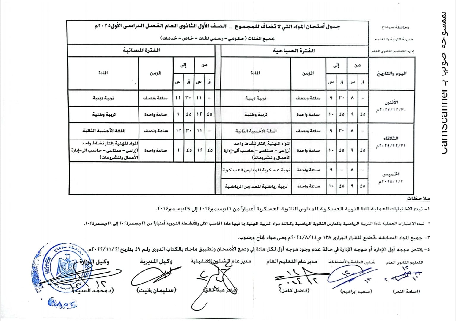 وفي سياق متصل، كشفت محافظة سوهاج عن جدول امتحانات الصف الأول الثانوي 2025 (المواد غير المضافة) عبر الصفحة الرسمية، وجاءت المواعيد كالتالي: