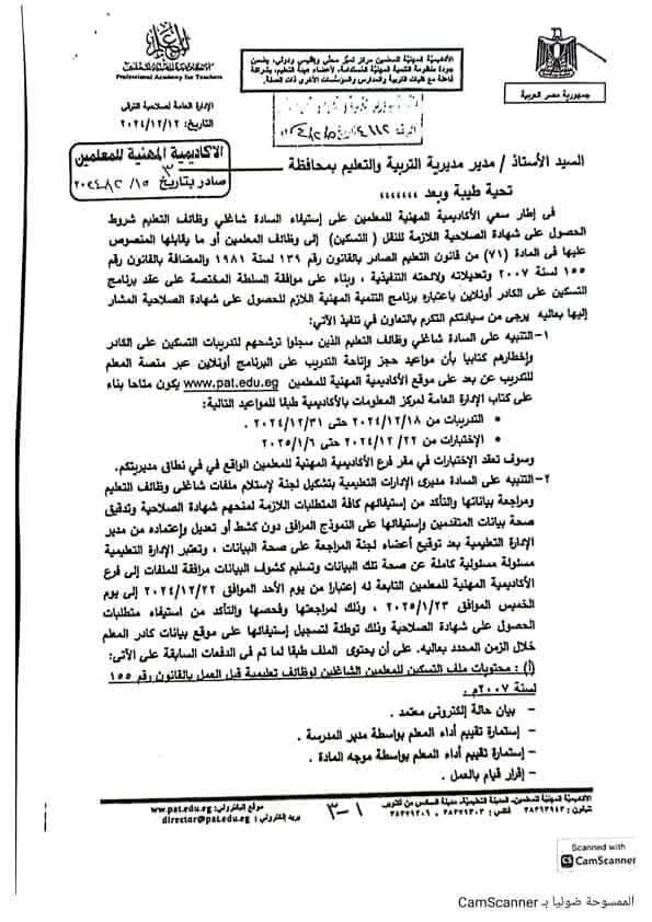 وقالت الأكاديمية المهنية للمعلمين، في خطابها، إنه في إطار سعي الأكاديمية المهنية للمعلمين على استيلاء شاغلي وظائف التعليم، شروط الحصول على شهادة الصلاحية اللازمة للنقل -التسكين- إلى وظائف المعلمين أو ما يقابلها المنصوص عليها في المادة 71 من قانون التعليم الصادر بالقانون رقم 139 لسنة 1981 والمضافة بالقانون رقم 100 لسنة 2007 ولائحته التنفيذية، وبناء على موافقة السلطة المختصة على عقد برنامج التسكين على الكادر أونلاين باعتباره برنامج التنمية المهنية اللازم للحصول على شهادة الصلاحية المشار إليها بعالية يرجى من التكرم بالتعاون في تنفيذ الآتي: