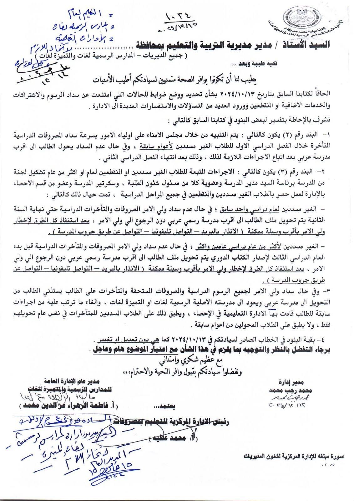 وقررت الإدارة العامة للمدارس الرسمية والمتميزة للغات بوزارة التربية والتعليم والتعليم الفني، أن يتم التنبيه من خلال مجلس الأمناء على أولياء الأمور بسرعة سداد المصروفات الدراسية المتأخرة خلال الفصل الدراسي الأول للطلاب غير المسددين لأعوام سابقة، وفي حال عدم السداد يحول الطالب إلى أقرب مدرسة عربي بعد اتباع الإجراءات اللازمة لذلك وذلك بعد انتهاء الفصل الدراسي الثاني.