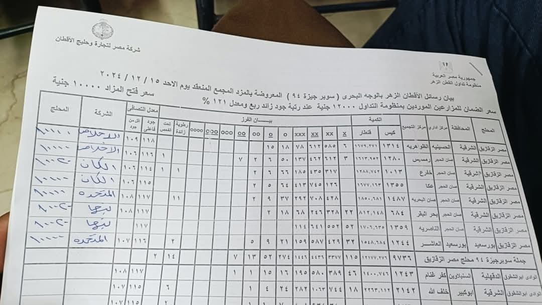 أظهرت بيانات شركة مصر لحليج الأقطان، تفاصيل مزادات بيع القطن في محافظات الوجه البحري التي أجريت الأسبوع الجاري.