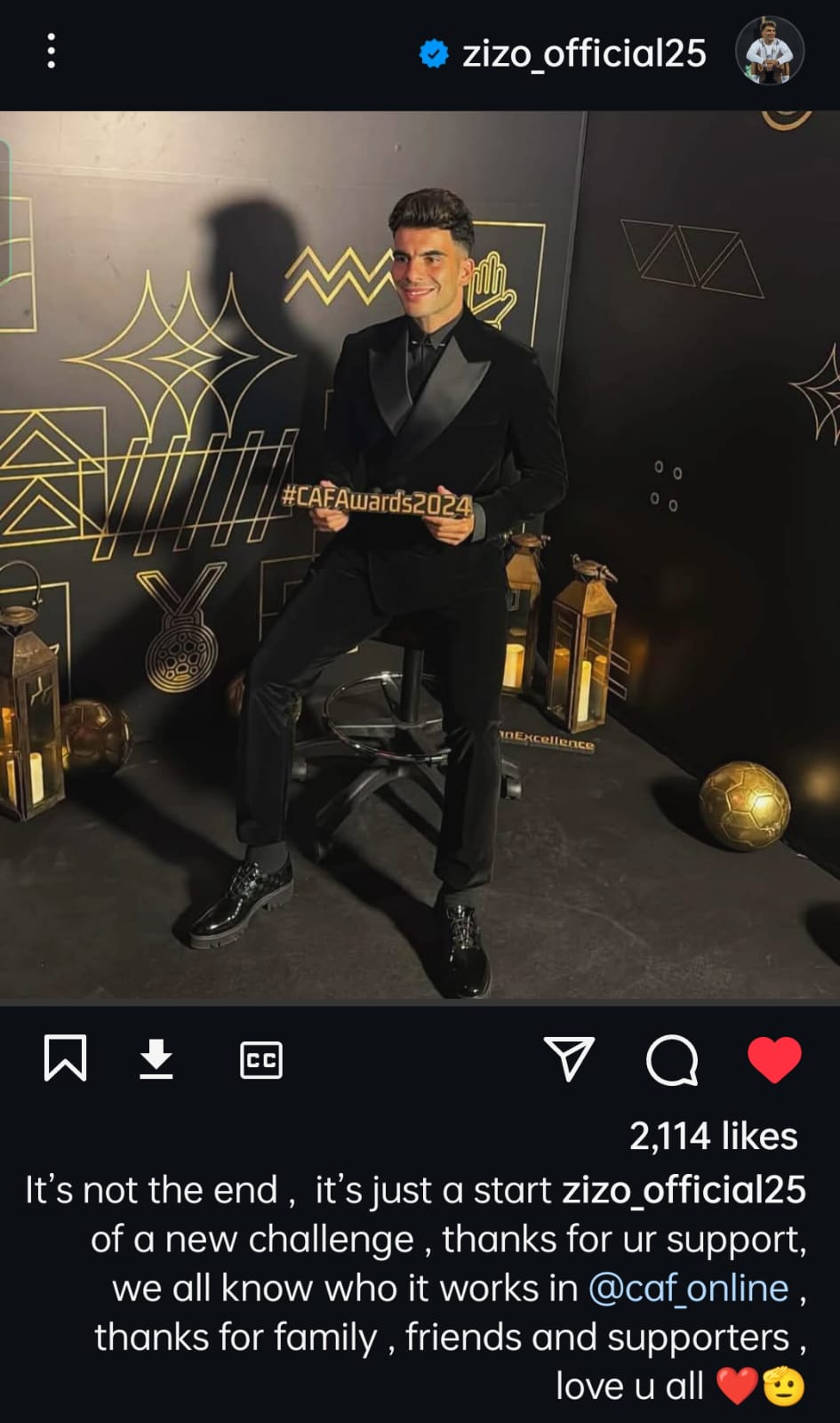 وقال زيزو في تصريحات عبر حسابه الرسمي على موقع التواصل الاجتماعي إنستجرام: إنها ليست النهاية، إنها مجرد بداية لتحدٍ جديد، شكرًا لدعمكم، نعلم جميعًا كيف تسير الأمور في كاف، شكرًا للعائلة والأصدقاء والداعمين، أحبكم جميعًا.