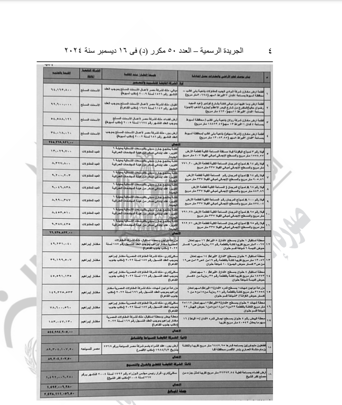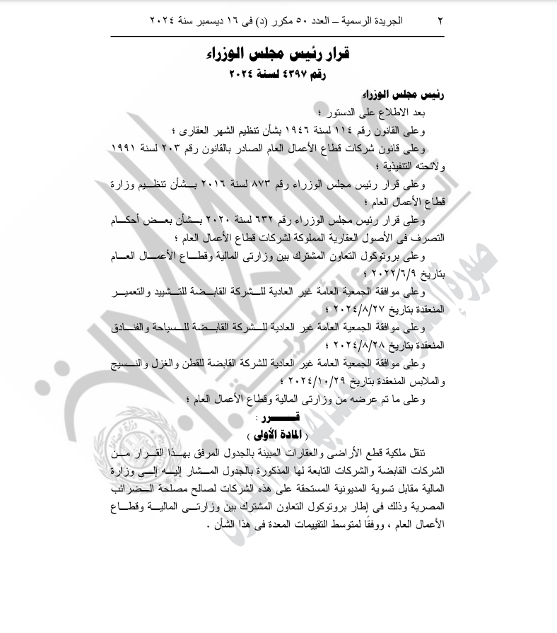 ونص القرار الصادر على أن تنقل ملكية قطع الأراضي والعقارات المبينة بالجدول المرفق بهذا القرار من الشركات القابضة والشركات التابعة لها المذكورة بالجدول المشار إليه إلى وزارة المالية مقابل تسوية المديونية المستحقة على هذه الشركات لصالح مصلحة الضرائب المصرية وذلك في إطار بروتوكول التعاون المشترك بين وزارتي المالية وقطاع الأعمال العام، ووفقا لمتوسط التقييمات المعدة في هذا الشأن.