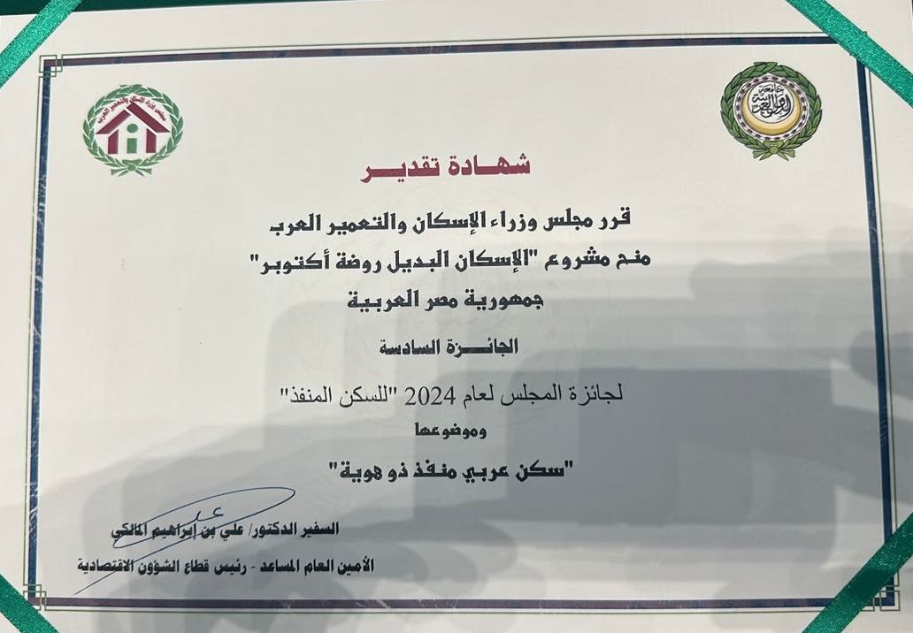 كما تسلم وزير الإسكان شهادة تقديرية لمصر عن المشروع السكني الإسكان البديل - روضة أكتوبر-، التابع لهيئة المجتمعات العمرانية الجديدة - جهاز مدينة حدائق أكتوبر.