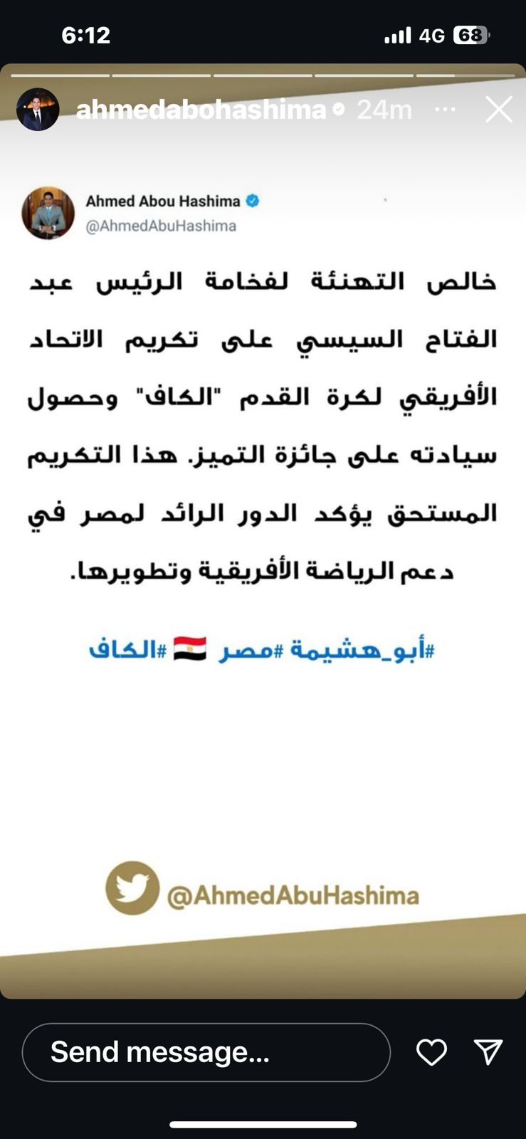 وقال أبو هشيمة: خالص التهنئة للرئيس عبد الفتاح السيسي على تكريم الاتحاد الإفريقي لكرة القدم كاف، وحصوله على جائزة التميز هذا التكريم المستحق يؤكد الدور الرائد لمصر في دعم الرياضة الأفريقية وتطويرها.