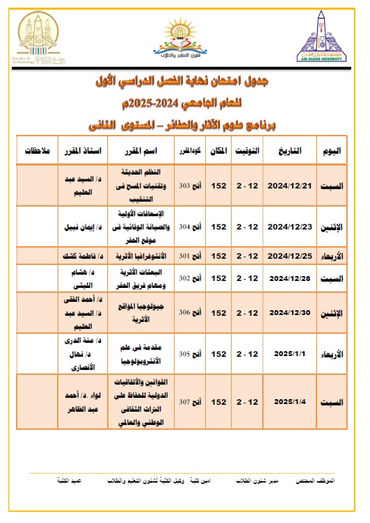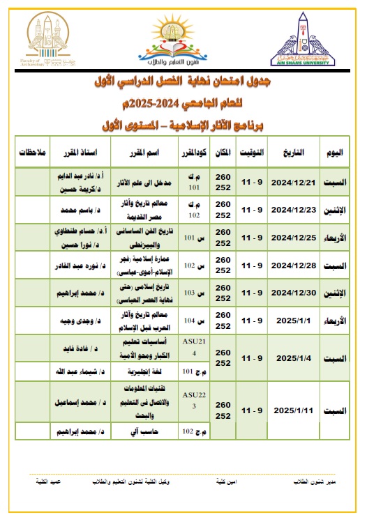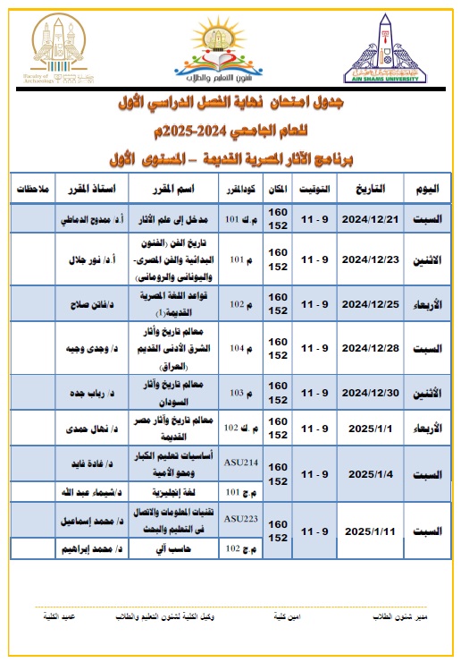 أعلنت كلية الآثار بـ جامعة عين شمس، جداول امتحانات الفصل الدراسي الأول للعام الدراسي الحالي 2024-2025 حتى يكون الطلاب على دراية بها قبل انطلاق الامتحانات بوقت كافٍ.