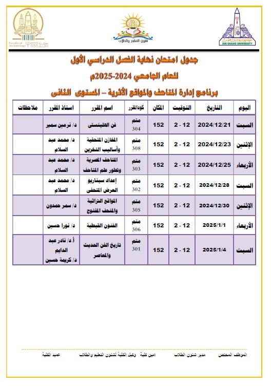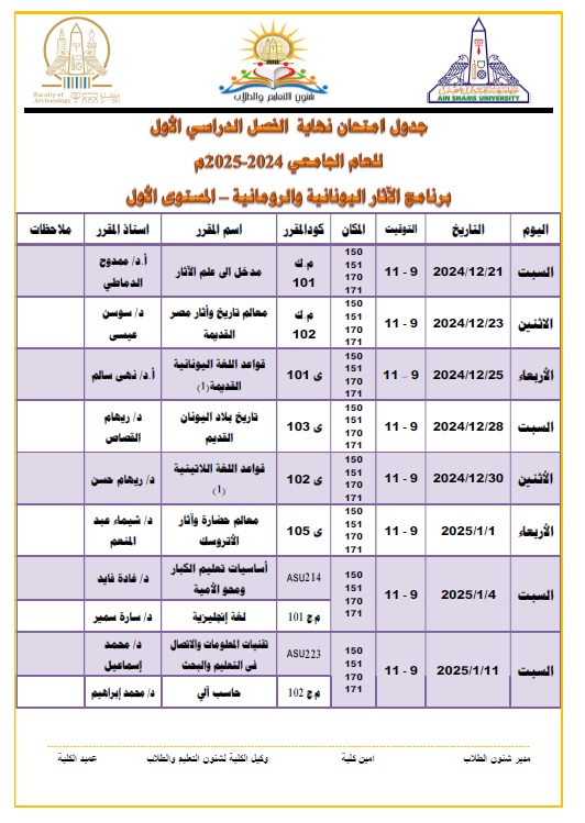 آثار عين شمس تعلن جداول امتحانات الفصل الدراسي الأول 2025| صور