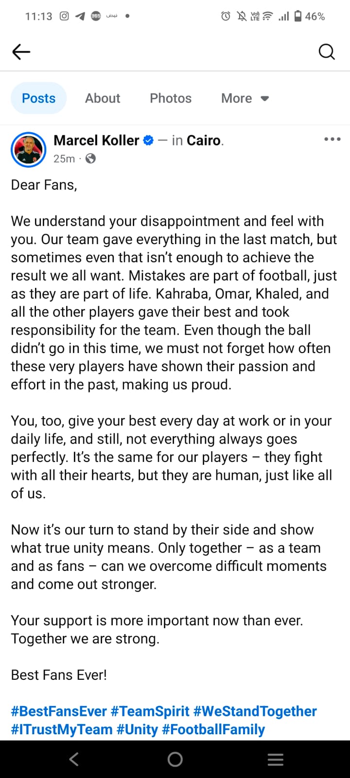 وقال كولر عبر حسابة على فيسبوك: أعزائي المشجعين، نحن نتفهم خيبة أملكم ونشعر بذلك معكم، بذل فريقنا قصارى جهده في المباراة الأخيرة، ولكن في بعض الأحيان لا يكون ذلك كافيا لتحقيق النتيجة التي نريدها جميعا.