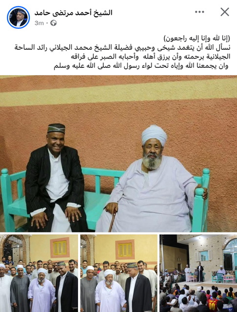 ونعت الساحة الرضوانية وكذلك ساحة الطيب في وقت سابق، وفاة رائد الساحة الجيلانية وشيخها بالأقصر، داعين الله أن يتغمده بواسع رحماته.