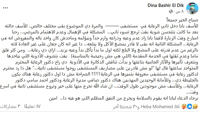 وقال ابنة السيناريست بشير الديك عبر فيس بوك، إن الحالة الصحية لـ والدها تزداد سوءًا، مطالبة الجميع بـ الدعاء له بـ الشفاء العاجل، حتى يمر من هذه الأزمة على خير.