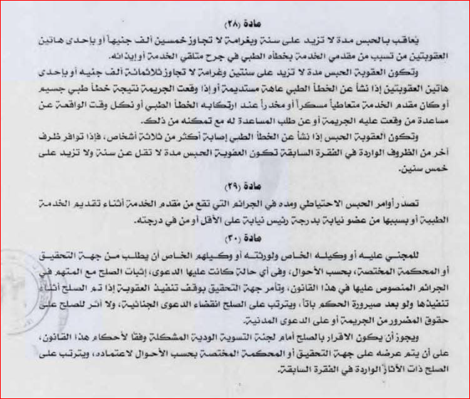 وأفادت بأن العقوبة تكون بالحبس مدة لا تزيد على سنتين وغرامة لا تجاوز 300 ألف جنيه أو بإحدى هاتين العقوبتين إذا نشأ عن الخطأ الطبي عاهة مستديمة، أو إذا وقعت الجريمة نتيجة خطأ طبي جسيم أو كان مقدم الخدمة متعاطيًا مسكرًا أو مخدرا عند ارتكابه الخطأ الطبي، أو نكل وقت الواقعة عن مساعدة من وقعت عليه الجريمة، أو عن طلب المساعدة له مع تمكنه من ذلك.