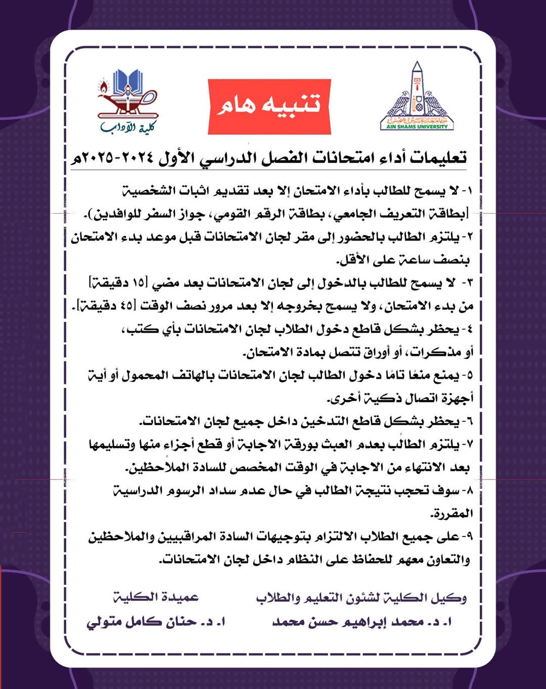 وجهت كلية الآداب بـ جامعة عين شمس، عدة تعليمات للطلاب عبر صفحتها الرسمية على فيسبوك، قبل بدء امتحانات الفصل الدراسي الأول للعام الدراسي الحالي 2024-2025 حتى يكونوا على دراية بها.