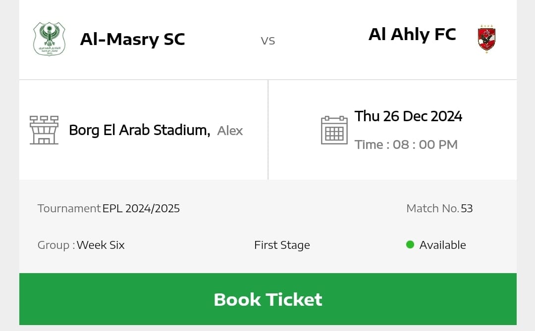 وفي السياق ذاته، طرحت شركة تذكرتي تذاكر مباراة الأهلي والمصري البورسعيدي المقرر إقامتها يوم 26 من الشهر الجاري.