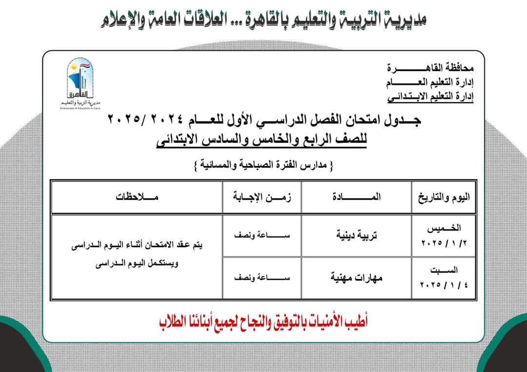 أما الرابع والخامس والسادس الإبتدائي وما يعادله سيؤدون الامتحانات في الفترة من السبت الموافق 11-1-2025حتى الخميس 16-1-2025.
