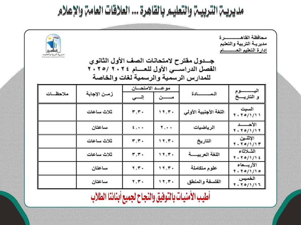 وجاء جدول امتحانات طلاب الأول الثانوي بالقاهرة كالتالي: