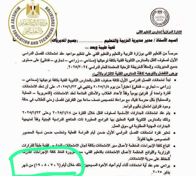وكانت خاطبت وزارة التعليم، مديري المديريات بضرورة عدم عقد أي امتحانات خلال أيام 6-7-8 من يناير المقبل، على أن يتم عقد الامتحانات فور انتهاء الاحتفالات بعيد الميلاد المجيد، واحتفالات الكريسماس.
