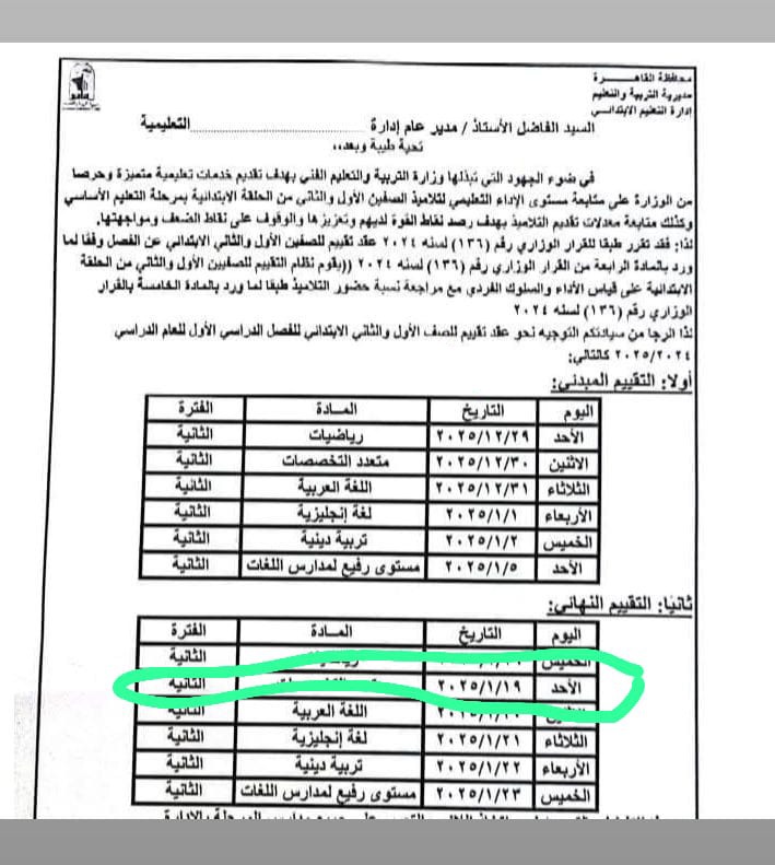 وأكدت المديرية في قرارها، أن متابعة معدلات تقييم التلاميذ تهدف لرصد نقاط القوة لديهم وتعزيزها، والوقوف على نقاط الضعف ومواجهتها، وفقا للقرار الوزاري رقم 131 لسنة 2021، بعقد تقييم للصفين الأول والثاني الابتدائي عن الفصل، وورد بالمادة الرابعة من القرار الوزاري رقم 139 لسنة 2020.