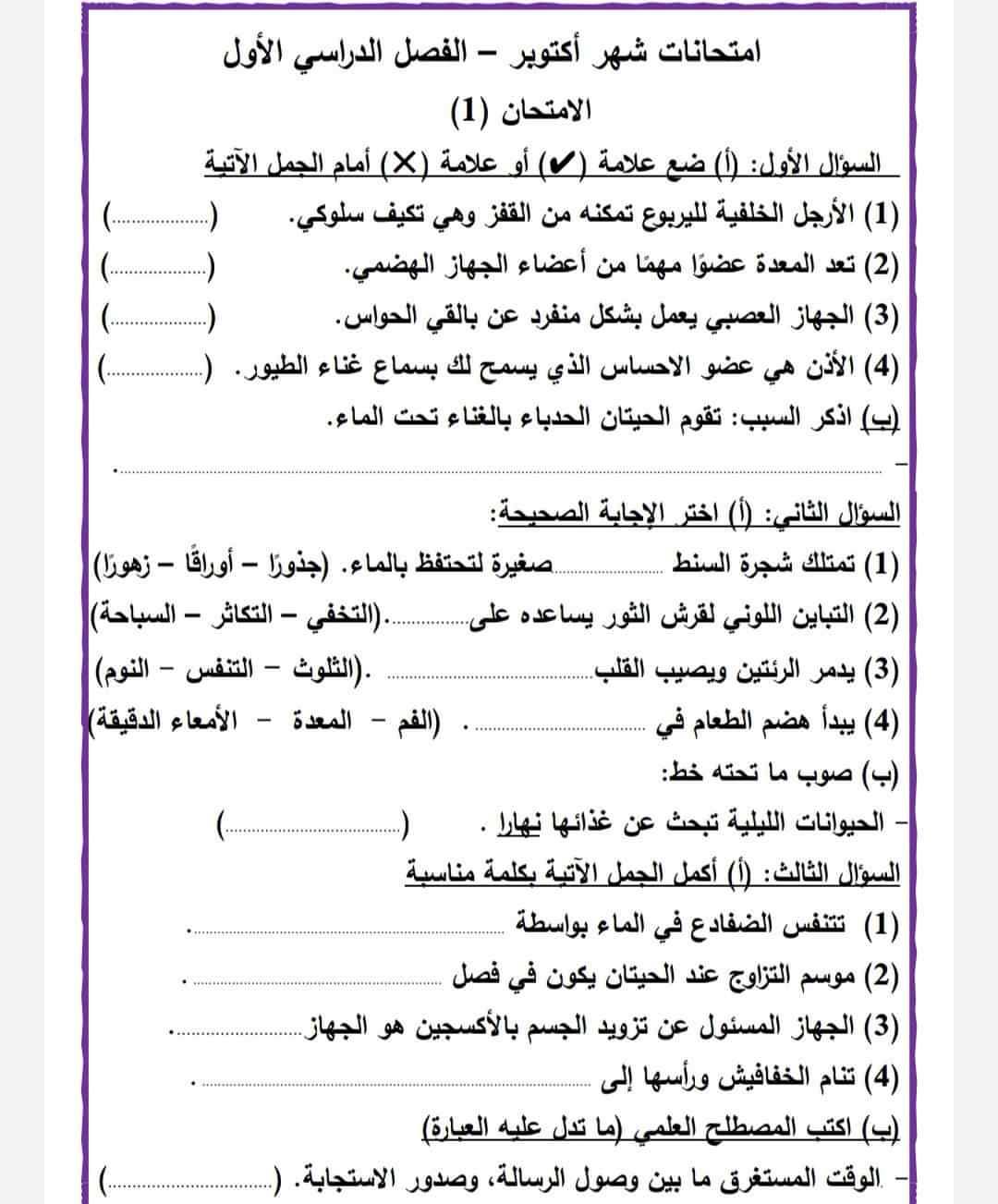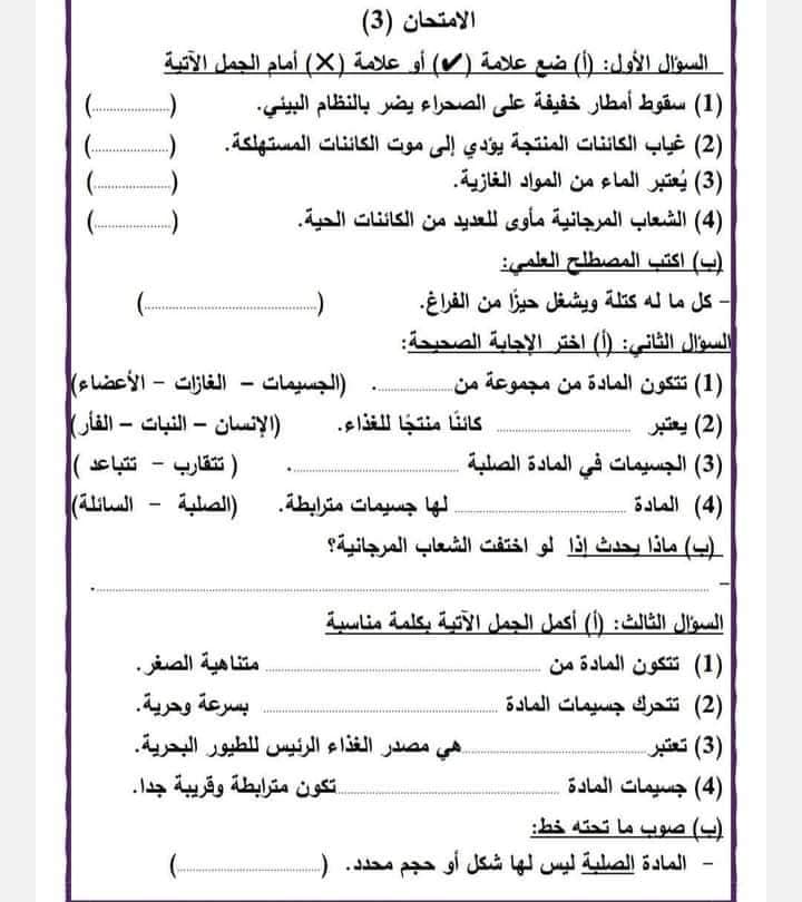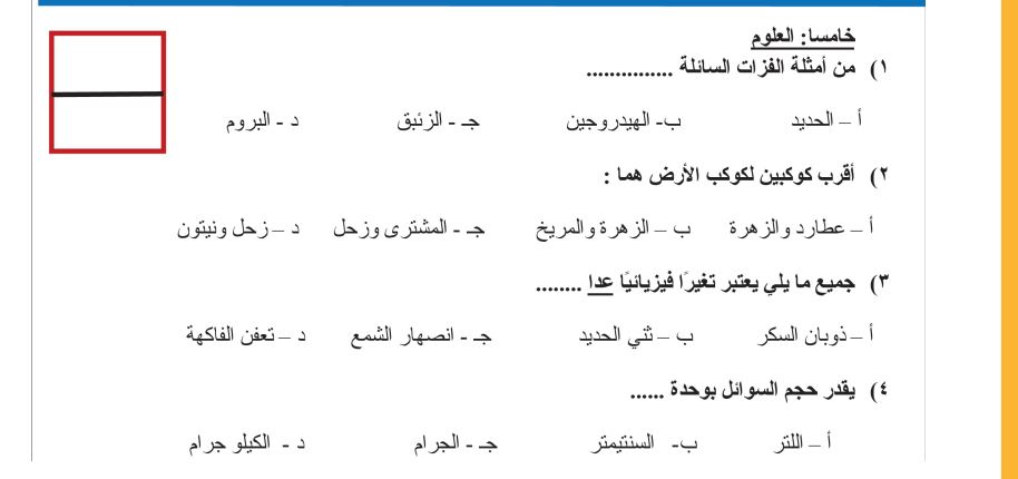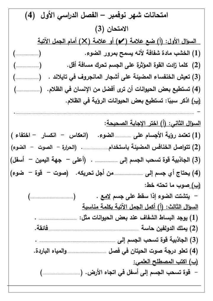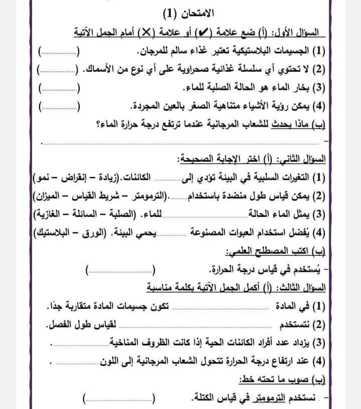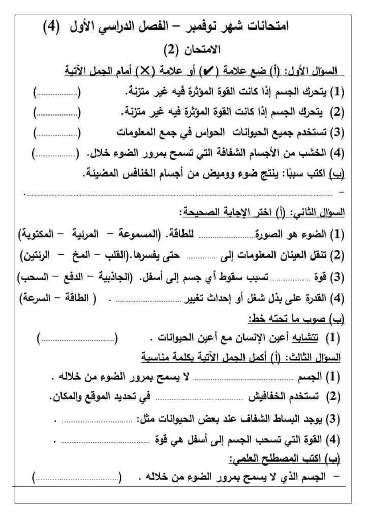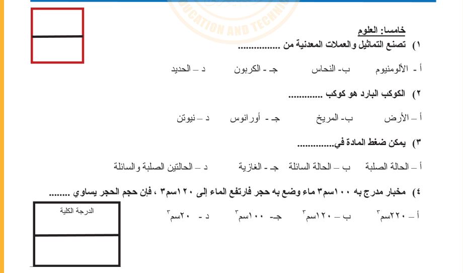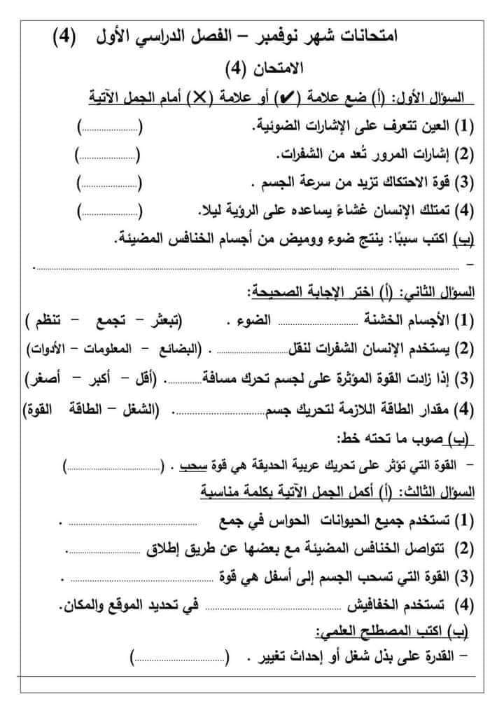 نماذج امتحانات الصف الرابع الابتدائي 2025 في مادة العلوم
