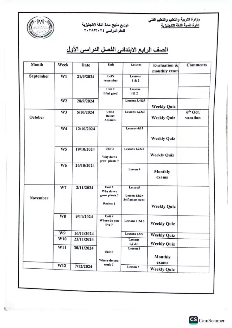 وحول توزيع منهج اللغة الإنجليزية للصف الرابع الابتدائي، التي يجب على الطالب مرجعاتها، بشكل منظم يضمن استيعاب الطلاب للمادة تدريجيًا، وجاء التوزيع كما يلي: