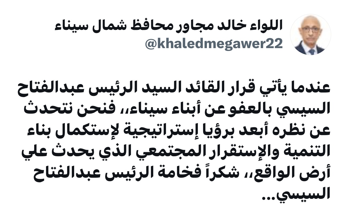 ثمّن اللواء خالد مجاور محافظ شمال سيناء قرار العفو الرئاسي عن عدد من أبناء المحافظة عبر صفحته على وسائل التواصل الاجتماعي والذي أصدره الرئيس عبد الفتاح السيسي.