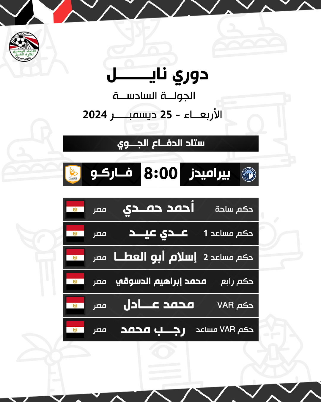 أعلن الاتحاد المصري لكرة القدم، أسماء حكام مباريات يوم الأربعاء، بالجولة السادسة من الدوري المصري الممتاز موسم 2024-25.