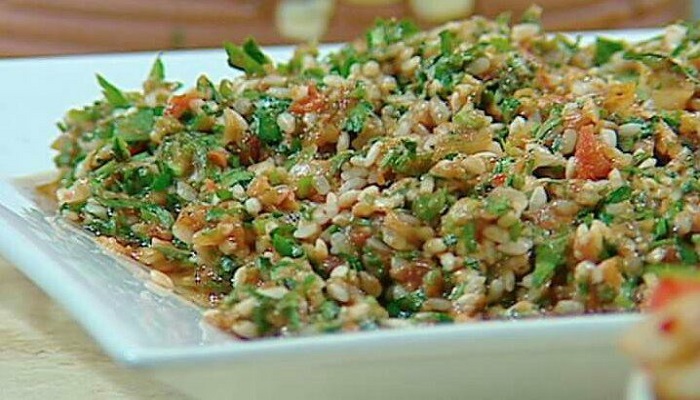 - إضافة البصل المفروم والخضرة المقطعة إلى الأرز.