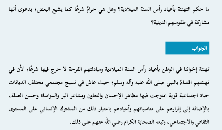 وأجابت دار الإفتاء على سؤال ما حكم التهنئة بأعياد رأس السنة الميلادية؟ وقالت في فتوى أخرى بتاريخ 24 يناير 2022، أن تهنئة إخواننا في الوطن بأعياد رأس السنة الميلادية ومبادلتهم الفرحة لا حرج فيها شرعًا؛ لأن في تهنئتهم اقتداءً بالنبي صلى الله عليه وآله وسلم؛ حيث عاش في نسيج مجتمعي مختلف الديانات حياة اجتماعية قوية امتزجت فيها مظاهر الإحسان والتعاون ومشاعر البر والمواساة وحسن الصلة.