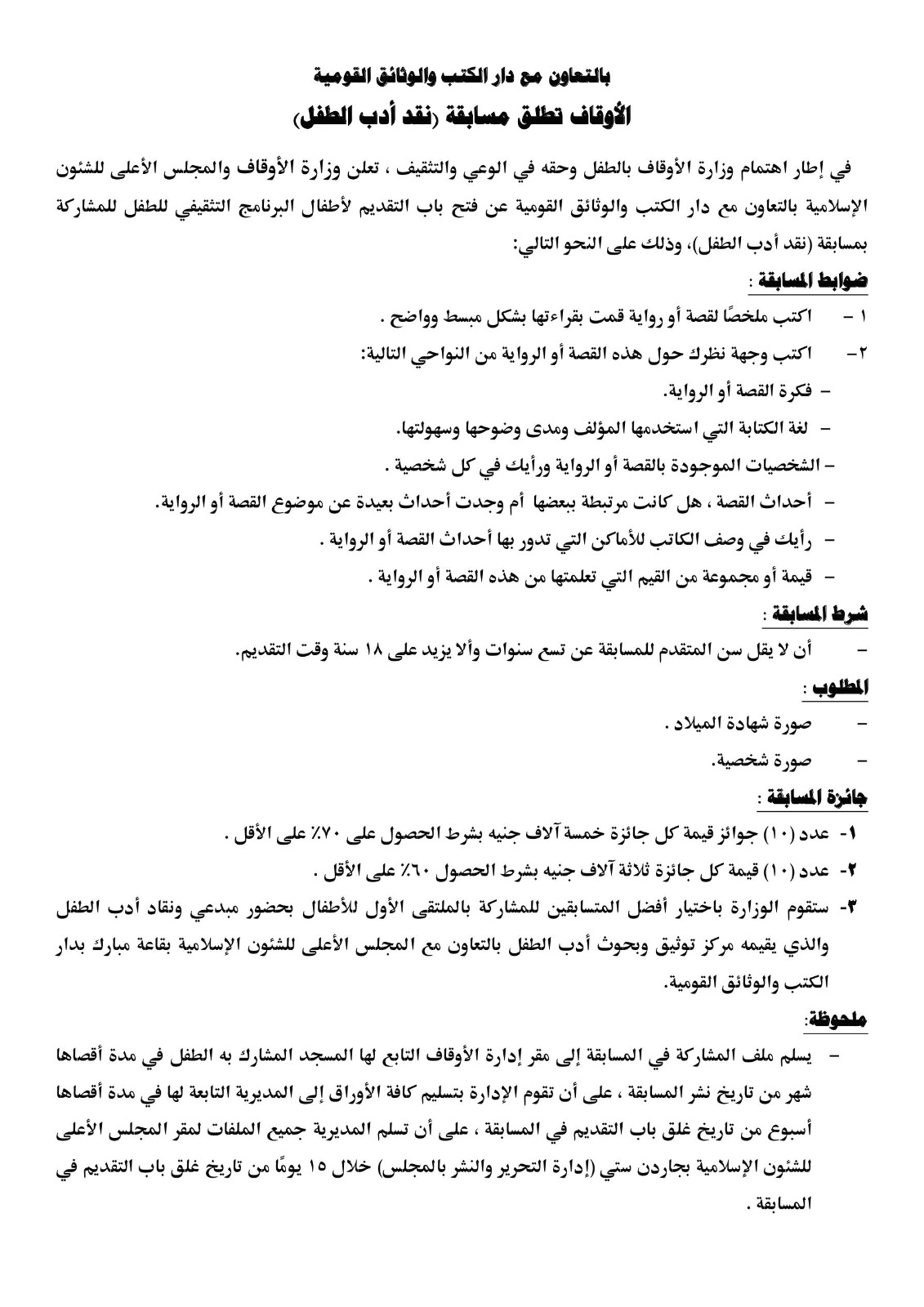 أعلنت وزارة الأوقاف والمجلس الأعلى للشئون الإسلامية، بالتعاون مع دار الكتب والوثائق القومية، إطلاق مسابقة نقد أدب الطفل، في إطار اهتمام الوزارة بتعزيز الوعي والتثقيف لدى الأطفال.