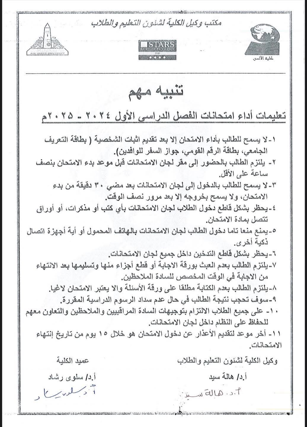وجهت كلية الألسن بـ جامعة عين شمس، عدة تعليمات للطلاب بشأن امتحانات الفصل الدراسي الأول للعام الدراسي الحالي 2024-2025، مشيرة إلى عدم السماح للطالب بأداء الامتحان إلا بعد تقديم إثبات الشخصية بطاقة التعريف الجامعي وبطاقة الرقم القومي، وجواز السفر للوافدين.