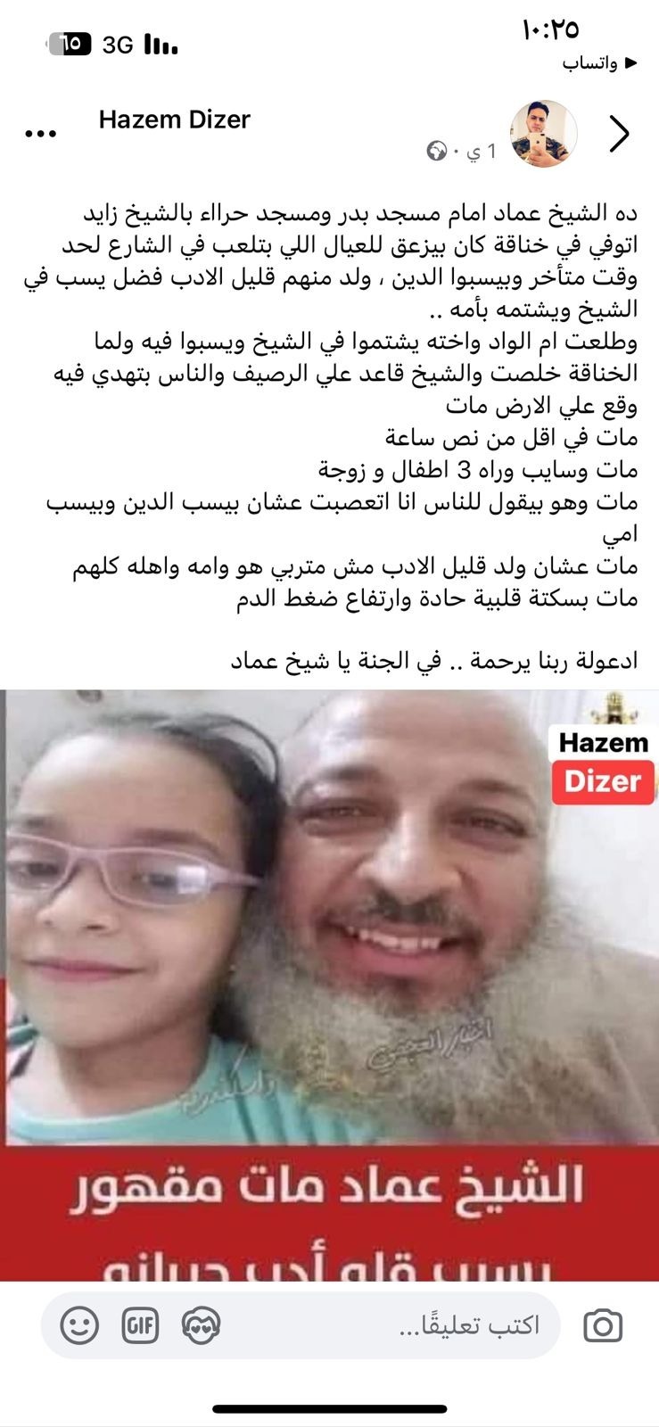 وكان رواد مواقع التواصل الاجتماعي، تداولوا منشورًا خلال الساعات الماضية جاء فيه: الشيخ عماد إمام مسجد بدر ومسجد حراء بالشيخ زايد اتوفي في خناقة كان بيزعق للعيال اللي بتلعب في الشارع، لحد وقت متأخر وبيسبوا الدين، ولد منهم قليل الادب فضل يسب في الشيخ ويشتمه بأمه وطلعت ام الولد وأخته يشتموا في الشيخ ويسبوا فيه ولما الخناقة خلصت والشيخ قاعد على الرصيف والناس بتهدي فيه وقع على الأرض مات.. مات في أقل من نص ساعة.. مات وسايب وراه 3 اطفال وزوجة.