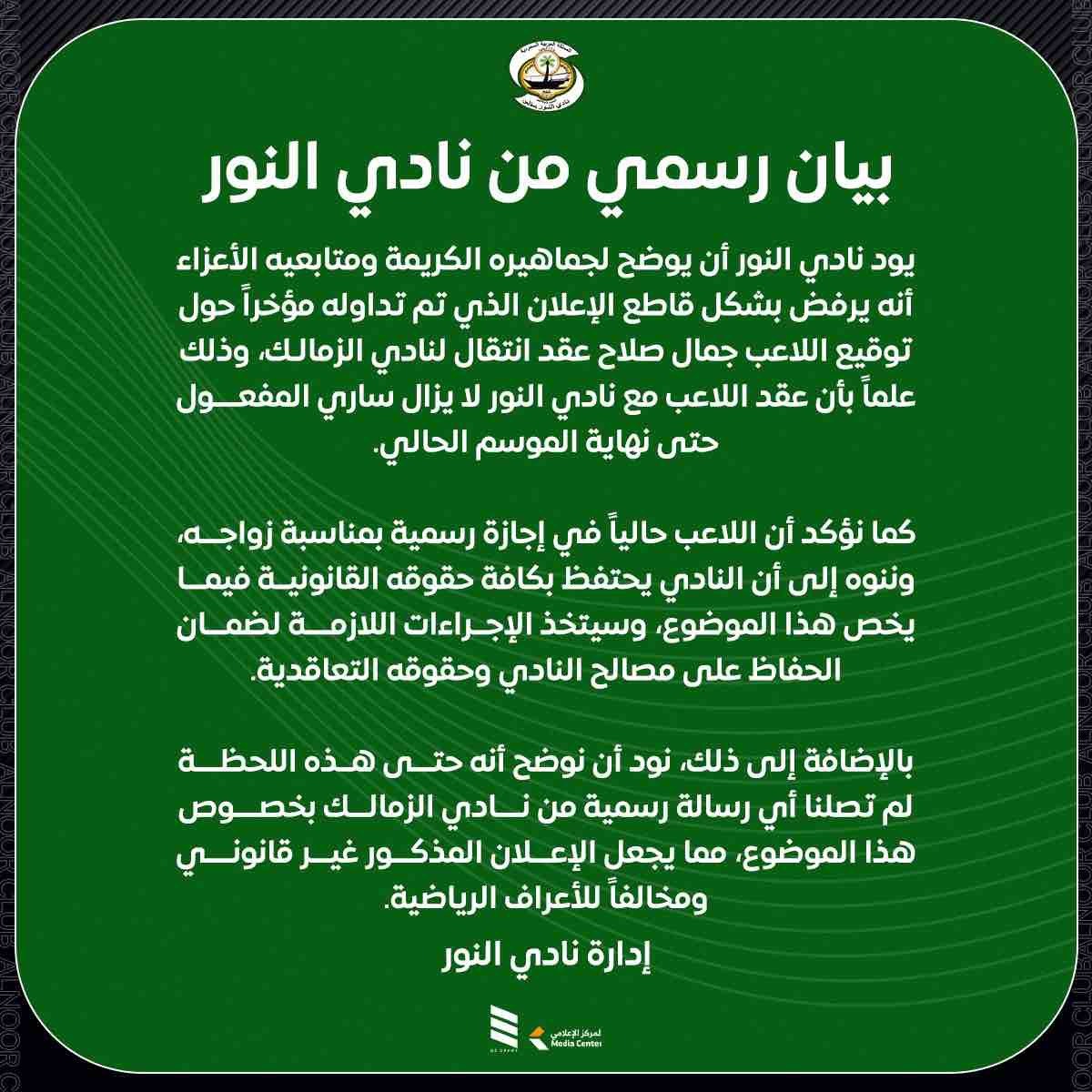 يود نادي النور أن يوضح لجماهيره الكريمة ومتابعيه الأعزاء، أنه يرفض بشكل قاطع الإعلان الذي تم تداوله مؤخرًا حول توقيع اللاعب جمال صلاح عقد انتقال لنادي الزمالك، وذلك علمًا بأن عقد اللاعب مع نادي النور لا يزال ساري المفعول حتى نهاية الموسم الحالي.
