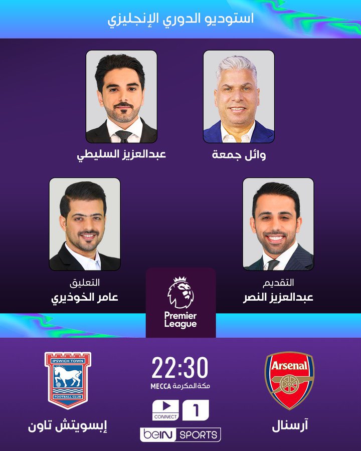 تعد شبكة beIN SPORTS هي المسؤولة عن تحديد القنوات الناقلة لمباراة أرسنال وإيبسويتش تاون في الدوري الإنجليزي، ضمن منافسة الجولة الثامنة عشر، إذ أعلنت عن نقل مباراة arsenal vs ipswich town مباشر عبر قناة بين سبورتس إتش دي 1، كما أنها خصصت أستوديو تحليلي يبدأ قبل انطلاق المواجهة في تمام الساعة 9.30 والمكون من (عبد العزيز النصر للتقديم) ووائل جمعة وعيد العزيز السليطي لتحليل المباراة.