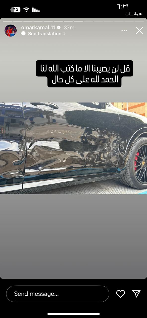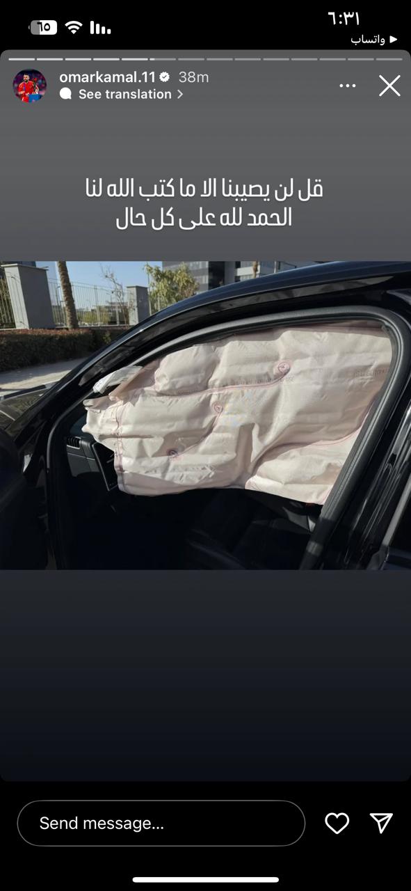 ونشر عمر كمال عبد الواحد على صفحته الشخصية عبر موقع التواصل الاجتماعي إنستجرام صورة سيارته وعلق عليها، قائلا: الحمد لله على كل حال، قل لن يصيبنا إلا ما كتب الله لنا.