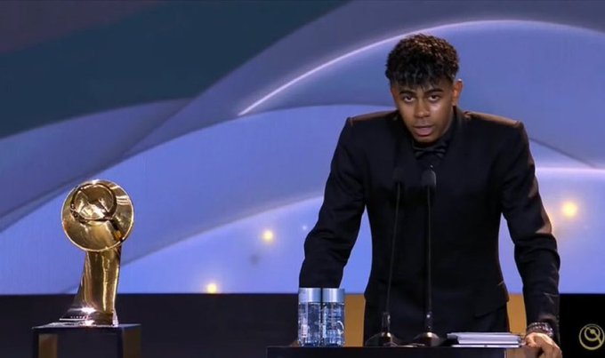 وقال لامين يامال: أشكر الجميع على تلك الجائزة خصوصًا أسرتي التي ساعدتني، وأشكر برشلونة النادي بتاعي الذين بفضلهم لم أكن هنا وزملائي في الفريق ومنتخب وأشكر كل الطواقم الفنية وتشافي وفليك وأشكرهم جميعًا.