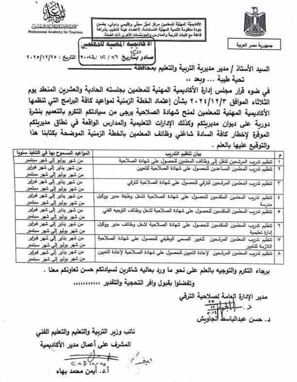 وجاء في الخطاب الذي عممته الأكاديمية المهنية للمعلمين، على المديريات التعليمية التابعة لها بكافة أنحاء الجمهورية، إنه في ضوء قرار مجلس الإدارة، والذي جاء في جلسة الإدارة الحادية والعشرين، والتي عقدت مطلع ديسمبر الجاري، بشأن اعتماد الخطة الزمنية لمواعيد كافة البرامج التي تنظمها الأكاديمية المهنية للمعلمين لمنح شهادة الصلاحية.