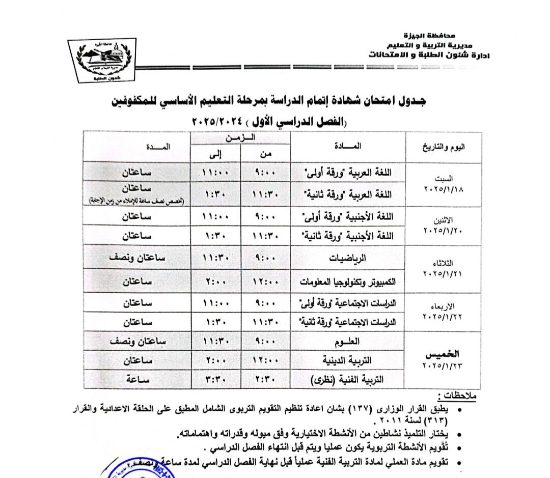 جدول امتحانات الشهادة الإعدادية 2025 محافظة الجيزة